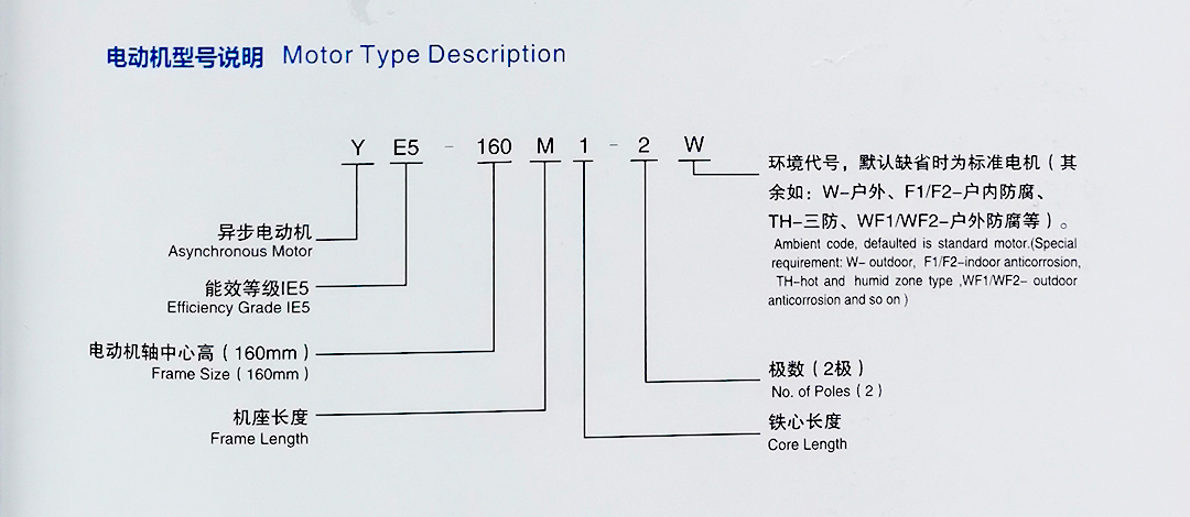 This series of motors are Ultra-high efficiency and energy saving three-phase asynchronous motors independently developed by our company.Cooling method is IC411,meeting GB/T 755 "Rotating ElectricalMachines-Ratings and Performance"and JB/T13299-2017"Specification for YE5 series(IP55) High Efficiency Three-phase Induction Motor(Frame size 63-355)".Its efficiency value complies with the level 1 energy efficiency standard in GB 18613-2012 and is consistent with the lE4 in the international standard IEC 60034-30 "Energy