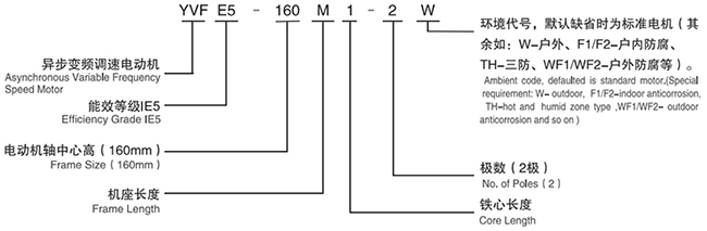 在這里西瑪品牌電機以YVFE5-160M1-2W為例:YVFE3—電機型號,YVF表示變頻調速,E4表示IE4超高高效率;160—中心高;M—機座長度代號;1—鐵芯長度代號;2—電機極數。W-戶外使用。